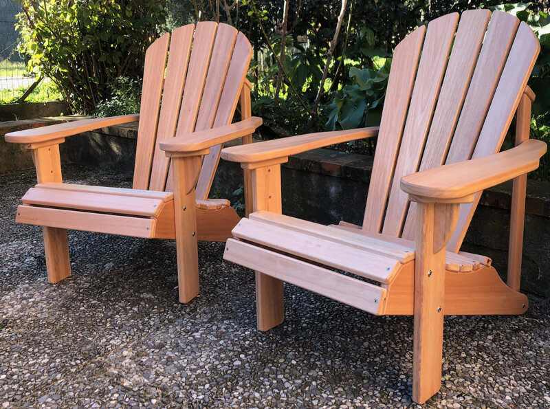 Sedia Adirondack con base ergonomica, schienale a 5 stecche a ventaglio. Costruzione in legno di Eucalipto estremamente resistente agli agenti atmosferici.
